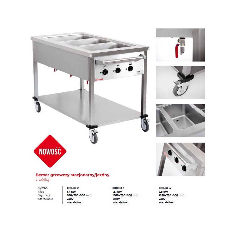 Zbiorniki posiadają wymiary umożliwiające umieszczenie pojemników GN 1/1 o głębokości h=200mm. Każda z komór może być niezależnie sterowana w zakresie od 30⁰ do 90⁰ C. Zbiorniki wyposażone są w zawory spustowe wody. Cały bemar wspiera się na czterech kółkach skrętnych (w tym dwa z hamulcem). Z jednej strony bemaru zamontowany jest uchwyt rurowy
